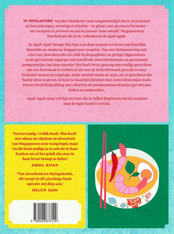 In Agak Agak brengt Shu Han Lee deze aanpak tot leven met heerlijke klassieke en moderne Singaporese recepten. Van een Hainanese kip met rijst voor doordeweeks tot chili-krabspaghetti, en pittige bijgerechten zoals gestoomde asperges met knoflook-zwartebonensaus en gestoomde pompoenrijst van haar moeder. Het boek bevat genoeg eenvoudige gerechten om een feestmaal te creëren of als een op zichzelfstaand gerecht te eten.