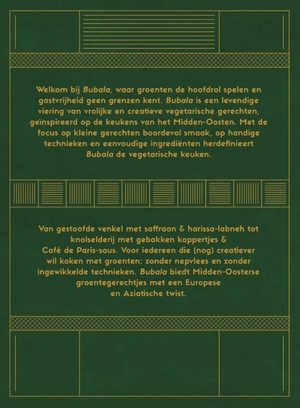 'Uitbundig vegetarisch' -The Guardian Welkom bij Bubala, waar groenten de hoofdrol spelen en gastvrijheid geen grenzen kent. Bubala is een levendige viering van vrolijke en creatieve vegetarische gerechten, geïnspireerd op de keukens van het Midden-Oosten. Met de focus op kleine gerechten boordevol smaak, op handige technieken en eenvoudige ingrediënten herdefinieert Bubala de vegetarische keuken. Van gestoofde venkel met saffraan & harissa-labneh tot knolselderij met gebakken kappertjes & Café de Paris-saus. Voor iedereen die (nog) creatiever wil koken met groenten: zonder nepvlees en zonder ingewikkelde technieken. Bubala biedt Midden-Oosterse groentegerechtjes met een Europese en Aziatische twist.