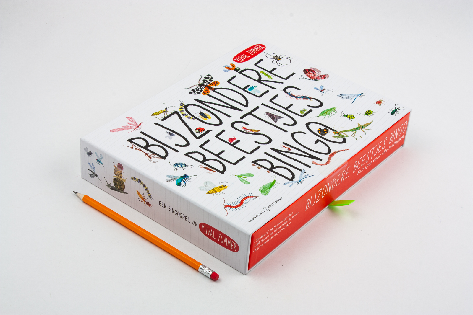 ‘Vlinder!’ ‘Mestkever!’ ‘Spuugbeestje!’ ‘BINGO!’ Zo leuk was bingo nog nooit! Maar liefst achtenveertig verschillende Zommerbeestjes, van een lieveheersbeestje tot een wandelende tak en van een komkommerkever tot een picassowants, zullen je laten lachen en griezelen terwijl je op jouw bingokaart zoekt of je ze hebt. Open de doos en ontdek een spelbord, acht dubbelzijdige speelkaarten, honderdvijftig fiches, achtenveertig beestjeskaartjes en een zakje om die kaartjes blind te kunnen trekken. En ook nog een miniboekje met spelregels en extra informatie over de bijzondere beestjes in deze bingo.