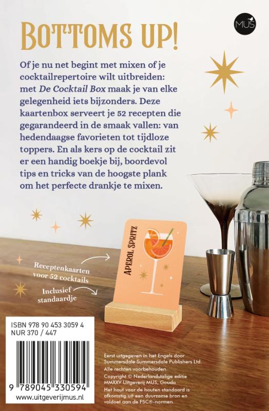 Of je nu net begint met mixen of je cocktailrepertoire wilt uitbreiden: met De Cocktail Box maak je van elke gelegenheid iets bijzonders. Deze kaartenbox serveert je 52 recepten die gegarandeerd in de smaak vallen: van hedendaagse favorieten tot tijdloze toppers. En als kers op de cocktail zit er een handig boekje bij, boordevol tips en tricks van de hoogste plank om het perfecte drankje te mixen.