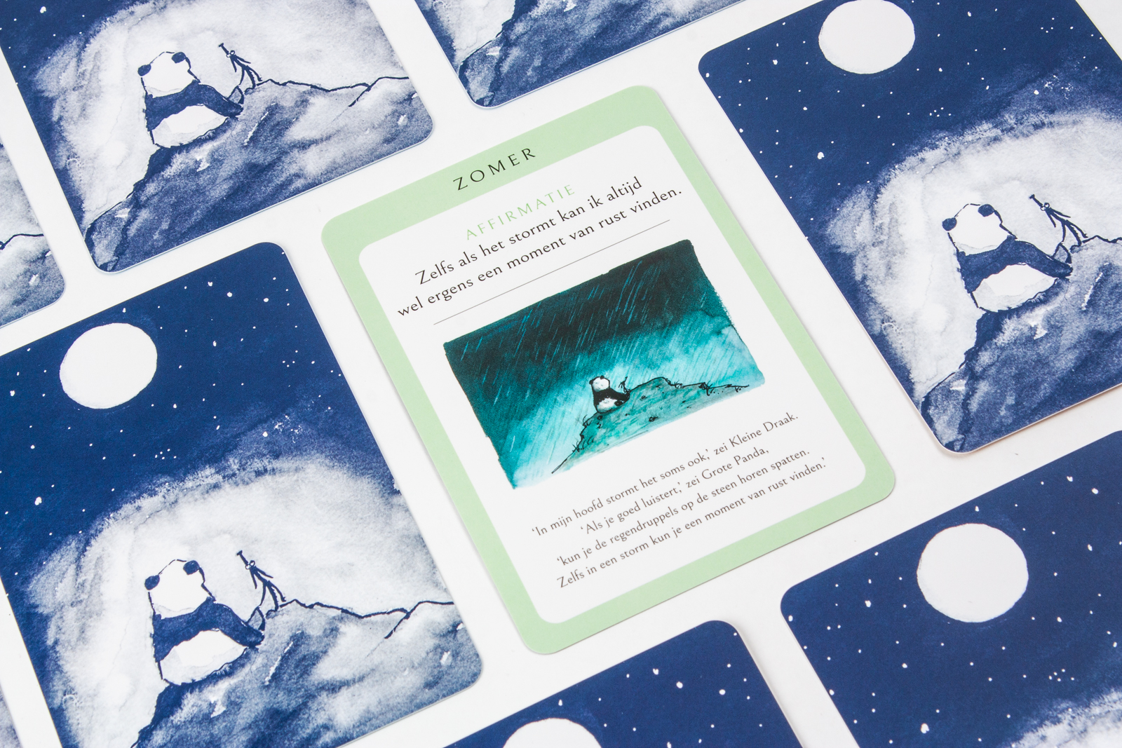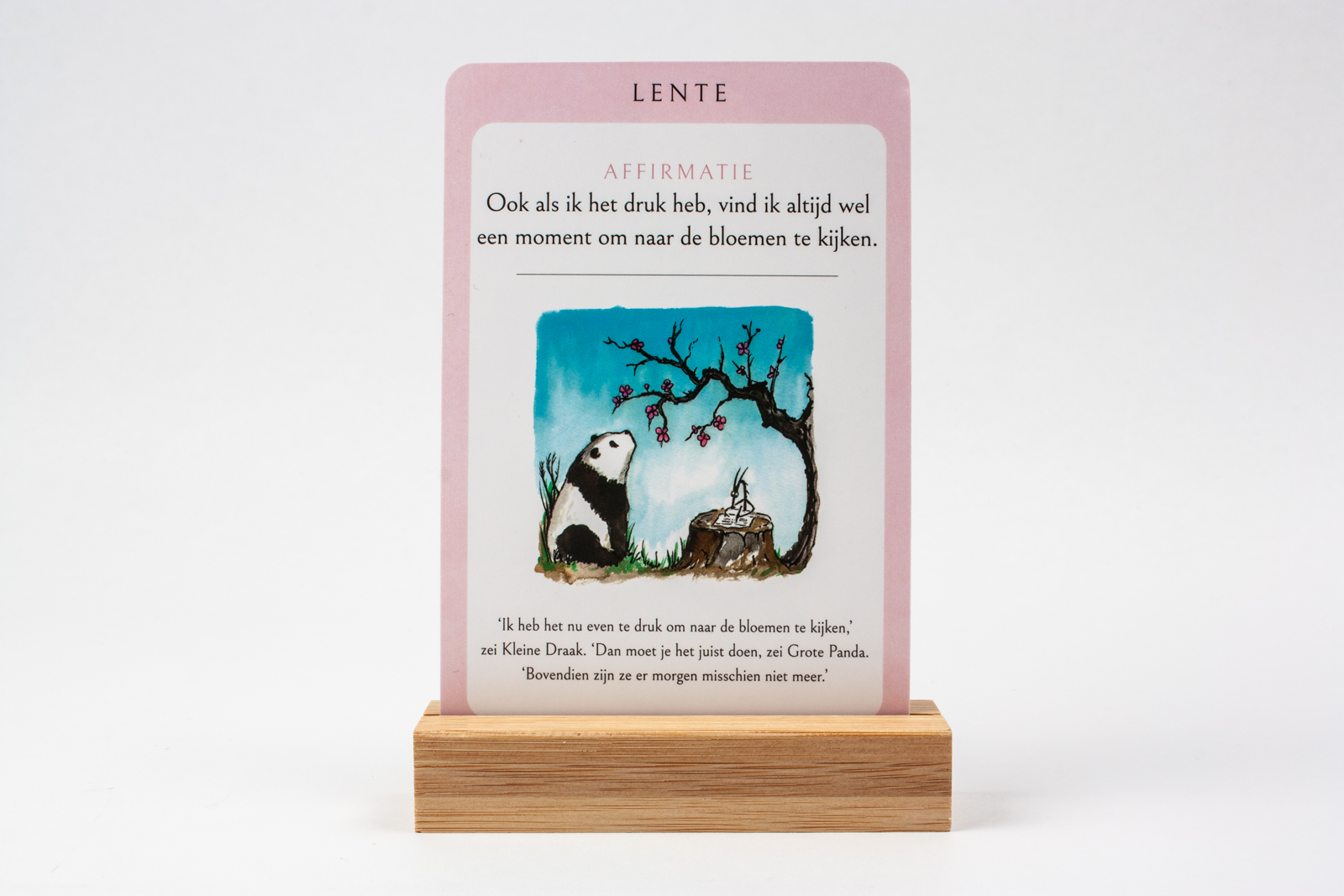 Grote Panda en Kleine Draak vinden kracht in het hier en nuVan bestsellerauteur James Norbury is deze prachtige set affirmatiekaarten die elk dag opnieuw inspiratie, motivatie en troost bieden. De citaten van Grote Panda en Kleine Draak moedigen aan om stil te staan en op een positieve manier naar het leven te kijken. Samen met de fraaie illustraties bieden de kaarten een moment van bezinning, de basis voor een meditatie of simpelweg een hart onder de riem voor iedereen die even in het hier en nu wil zijn. Zo reis je mee door de veranderende seizoenen en vind je de kracht om dagelijkse uitdagingen aan te gaan. Inclusief houten standaard waarin de kaart gezet kan worden voor inspiratie gedurende de dag.• Inspirerende kaarten voor jong en oud• Voor thuis of onderweg• Compleet met houten standaard