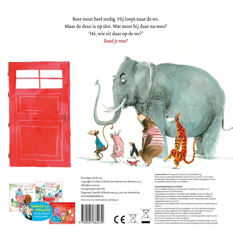 Nu als groot kartonboek met geluidsbutton: druk op de knop en... SWOESJH! Beer moet heel nodig. Hij loopt naar de wc. Maar de deur is op slot. Wat moet hij daar nu mee? 'Hé, wie zit er op de wc?' Raad je mee? Beer en zijn vrienden moeten heel lang wachten voordat de deur van de wc eindelijk opengaat... Favoriet van kinderen, voorleesouders, juffen en meesters. Ga jij ook al op de grote wc? Een leuk boek voor de zindelijkheidstraining. En nog steeds een voorleessucces daarna. Van Harmen van Straaten, grappig, ondeugend en net even anders.