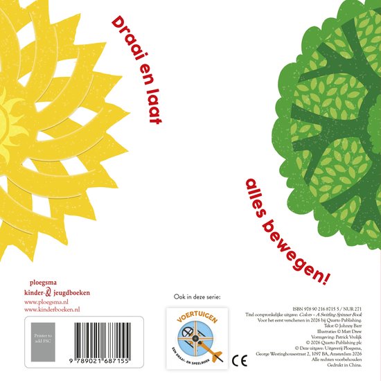 Dit kleurrijke kartonboek is leuk om mee te spelen, samen met je baby of peuter. Op elke spread vind je een draaiende spinner. Perfect voor de ontwikkeling van de fijne motoriek van jonge kinderen, en hun visuele waarneming. De woorden zijn eenvoudig, en de tekst erbij is op rijm. Het contrastrijke ontwerp spreekt de allerkleinsten aan. In dezelfde serie is ook een boek over Voertuigen verschenen. Samen lezen was nog nooit zo interactief!