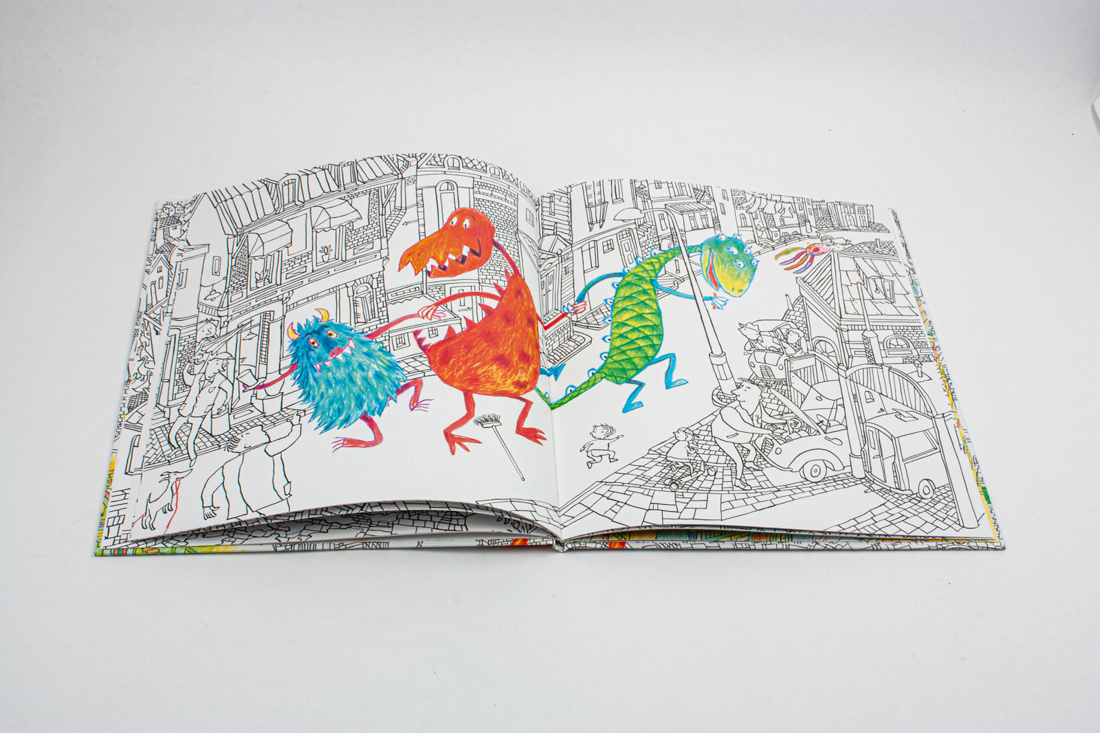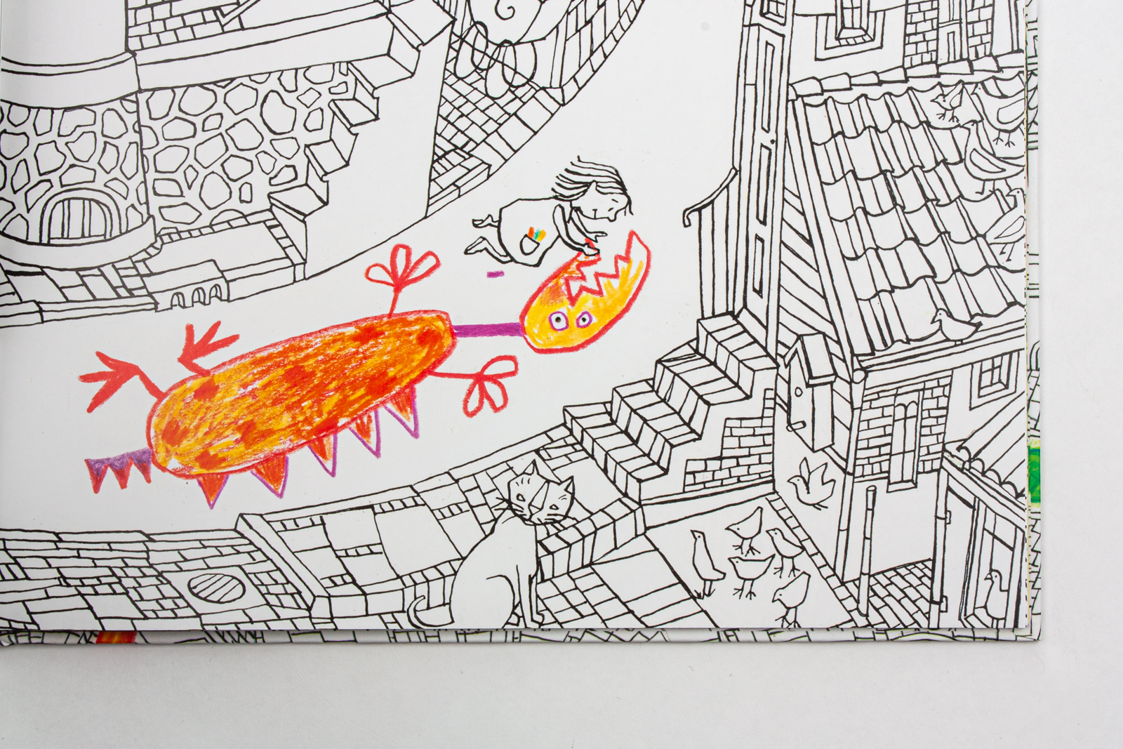 Gouden Penseel 2015! Een boek dat kleur brengt in de wereld...en hoe! In een zwart-witte stad loopt een meisje met haar krijtjes. In kleurige lijnen tekent ze de meest wonderlijke monsters, die - zodra ze verder loopt - één voor één tot leven komen. De kleurrijke monsters zetten het rustige stadje volledig op z'n kop. De chaos kan maar ternauwernood worden ingetoomd... of toch niet? Op de gedetailleerde prenten valt zoveel te ontdekken dat dit woordeloze prentenboek iedere keer dat u het openslaat een nieuw verhaal vertelt. Een heerlijk boek, waarbij u wel gewaarschuwd bent: hou krijtjes na het (voor)lezen maar uit de buurt van uw kinderen!