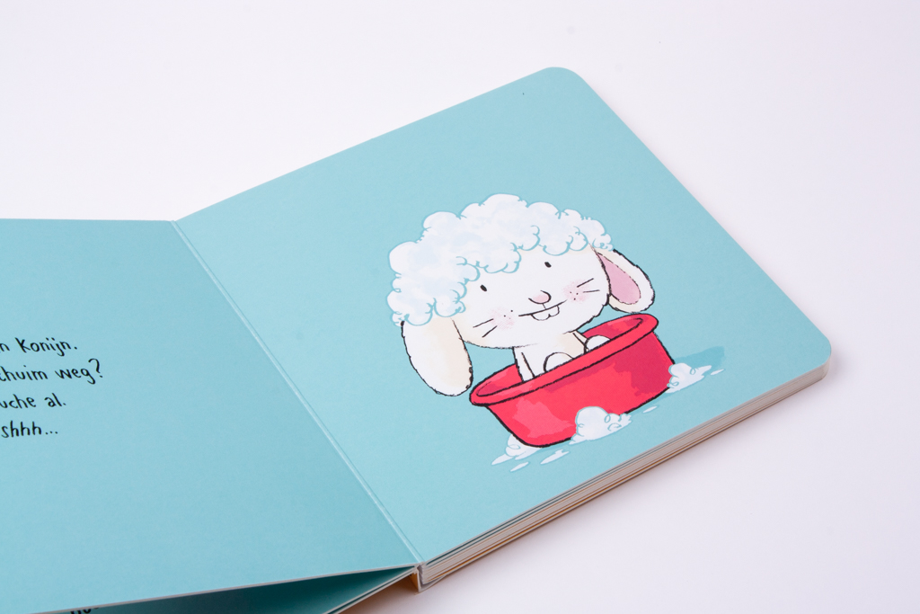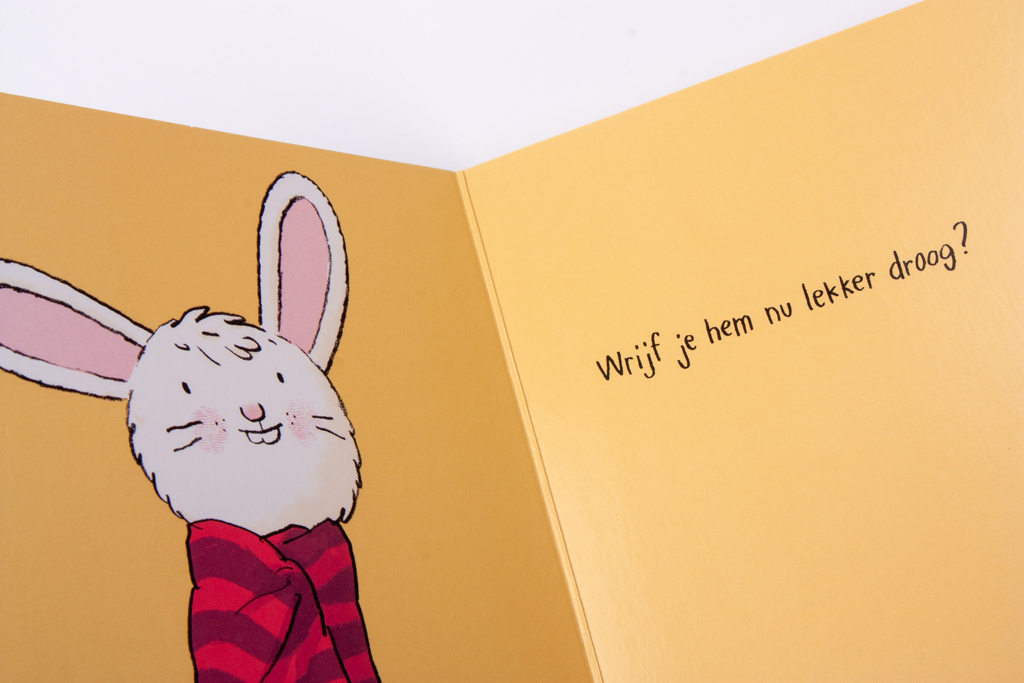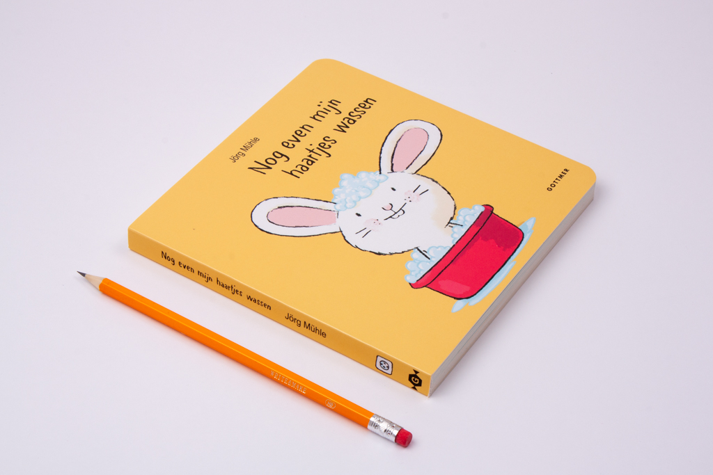 Nog even mijn haartjes wassen' is een lief peuterboek van de Duitse kinderboekenschrijver Jorg Mühle. Dit boekje over badderen is ideaal voor de jonge iPad-generatie. Het is de hoogste tijd: Klein Konijn moet in bad. Zijn teiltje is al vol. Maar waar is Klein Konijn eigenlijk? Roep hem maar eens, dan komt hij vast tevoorschijn. En help je ook mee zijn haartjes te wassen? Dat vindt hij niet zo fijn. Pas maar op dat hij geen schuim in zijn oogjes krijgt! In dit lieve voorleesboekje wordt badderen een interactief spel. Peuters worden aangemoedigd Klein Konijn te helpen met wassen, spoelen, afdrogen en haartjes föhnen. Met als resultaat: een brandschoon Klein Konijn. Lief! 'Nog even achter mijn oortjes kriebelen', nog zo'n leuk boekje van Jorg Mühle, werd door BoekStart genomineerd als Babyboekje van het Jaar 2016. De boekjes zijn extra leuk voor boekje voor kinderen die graag op de iPad spelen: net als op de tablet kun je 'tappen' en 'swipen', maar dan in een papieren boek!