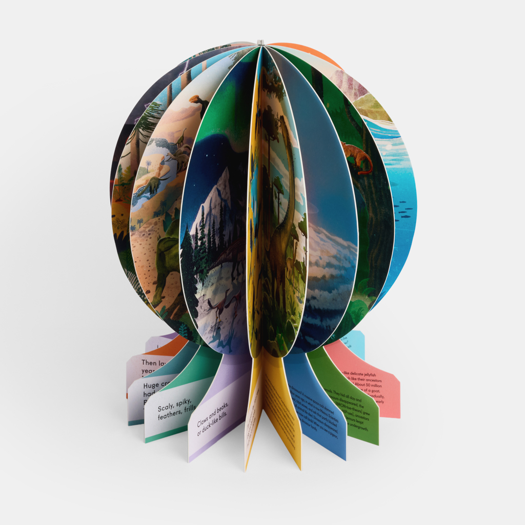 A rhyming, read-aloud introduction to dinosaurs and early life on our planet that, when opened up and folded back, creates a free-standing globe This exciting addition to the bestselling Our World collection invites children to explore life on our prehistoric planet through rhyming verse and stunning illustrations. Beginning with the origins of early life in the oceans billions of years ago, Our Prehistoric Planet travels chronologically through the development of giant crocodile-like lizards, the reign of the dinosaurs, mass extinction events, and the rise of early mammals. Along the way, readers will meet incredible creatures from across the globe, from familiar favorites like Stegosaurus to the bizarre brontothere, an enormous, rhino-like mammal with giant horns over 3 feet long. Additional text throughout offers more detailed information and friendly interactive questions, encouraging readers to learn about the amazing creatures that, millions of years ago, stomped or swam where we live today. Inspiring, informative, and one-of-a-kind, this artful homage to our prehistoric world is both an invitation to travel back in time and an object to be treasured for years to come.