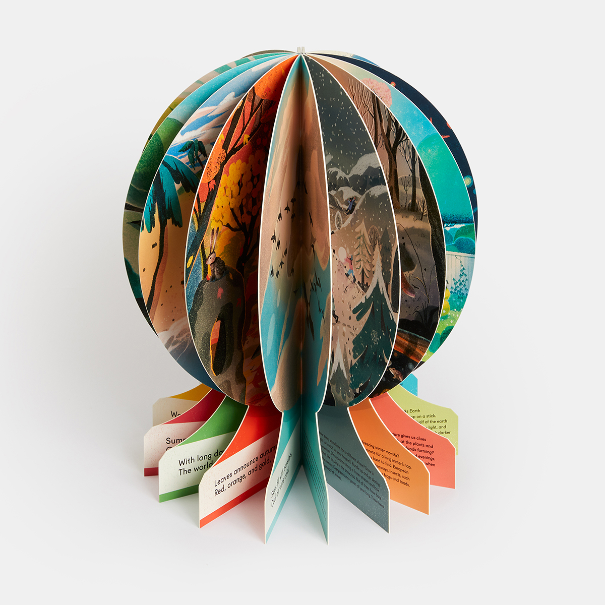 Explore Earth’s four seasons with this charming read-aloud introduction to weather around the world. Beautifully illustrated and cleverly designed, Our Seasons opens and folds back into a sturdy circular globe fastened by a hidden magnetic closure. Rhyming verse and lush illustrations teach young children to identify and experience nature’s circle of seasons – from vibrant autumn and frosty winter to blossoming spring and bountiful summer. Secondary text offers more detailed, curriculum-focused facts and encourages children to consider their own environments, presenting a personal perspective set against a global backdrop. Inspiring, informative, and one-of-a-kind, this artful homage to Earth is both an invitation to explore the natural world and an object to be treasured for years to come.
