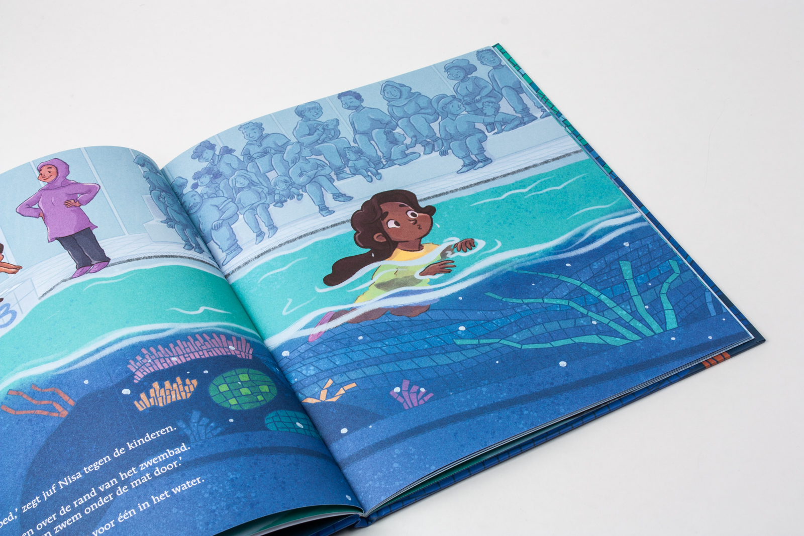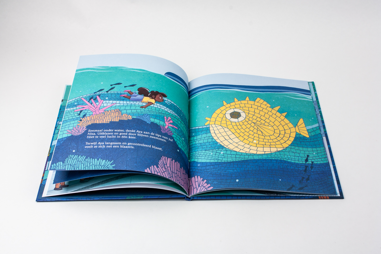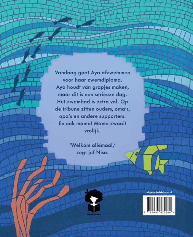 Vandaag gaat Aya haar zwemdiploma halen! Ze heeft haar allerleukste badpak aangetrokken: een oranje met een groene vis erop. Ze bibbert een beetje... het water lijkt megadiep. Aya kijkt snel naar haar moeder, die haar een dikke duim omhoog geeft. Dan haalt Aya diep adem en... PLONS!