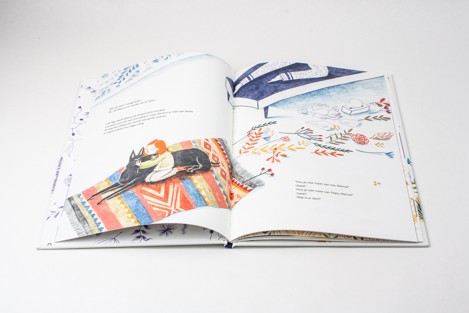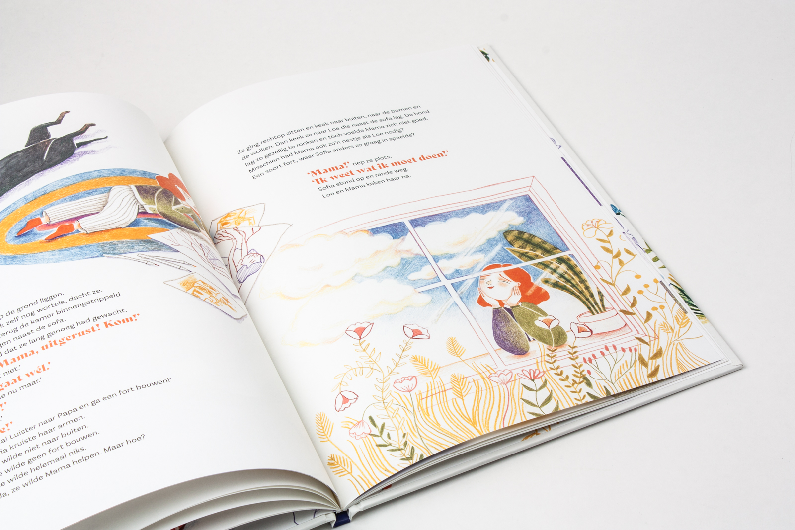 Mama lag op de sofa. Ze sliep niet, ze lag gewoon. ‘Hou je niet meer van me?’ vroeg Sofia. ‘Jawel,’ antwoordde mama. ‘Wat is er dan?’ Toen kwam papa de kamer binnen en zei: ‘Mama is ziek.’ Sofia probeerde alles wat ze kon bedenken. Ze trok aan mama’s benen. Maar het leek wel alsof mama wortels had. Ze keek onder de sofa: geen wortels te zien. Ze begon te praten, te smeken, vragen te stellen. Niets hielp. ‘Ga een fort bouwen buiten,’ zei papa. En toen kreeg Sofia een idee …