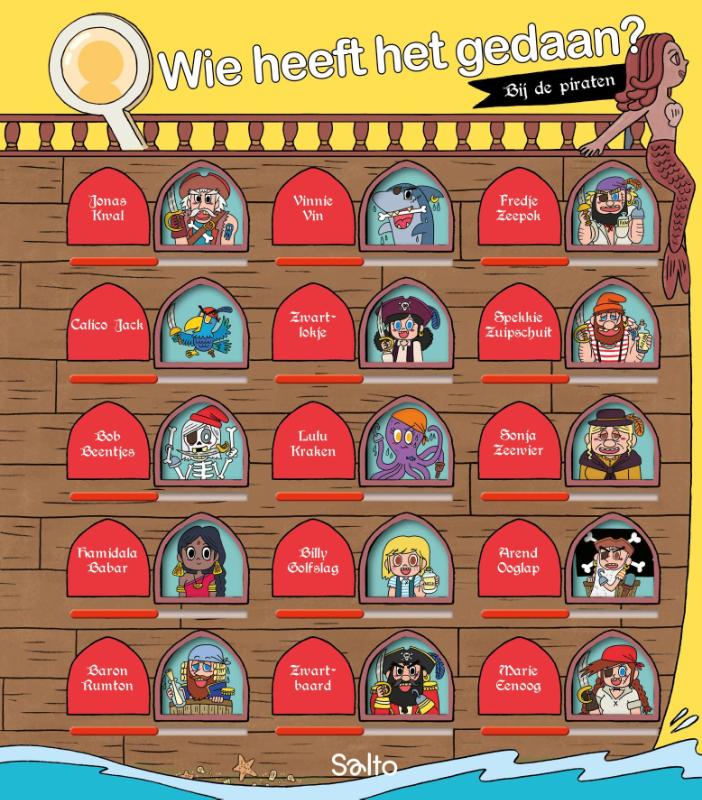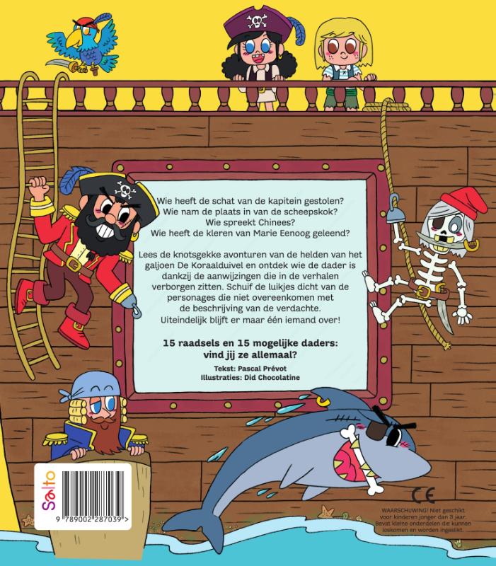 Wie hee de schat van de kapitein gestolen?Wie nam de plaats in van de scheepskok?Wie spreekt Chinees?Wie heeft de kleren van Marie Eenoog geleend? Lees de knotsgekke avonturen van de helden van het galjoen De Koraalduivel en ontdek wie de dader is dankzij de aanwijzingen die in de verhalen verborgen zitten. Schuif de luikjes dicht van de personages die niet overeenkomen met de beschrijving van de verdachte.Uiteindelijk blijft er maar één iemand over! 15 raadsels en 15 mogelijke daders: vind jij ze allemaal?