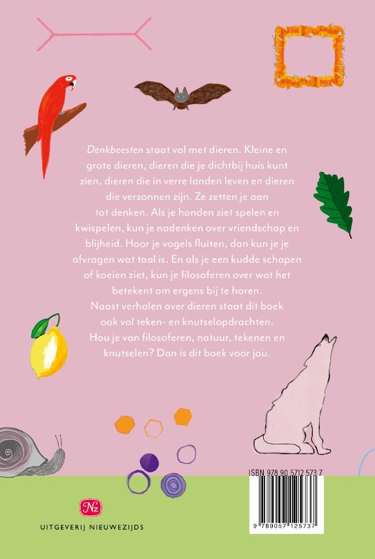 Misschien ben je een sloddervos, een angsthaas of zo koppig als een ezel. Mensen vergelijken zichzelf vaak met (andere) dieren. Zijn vossen echt slordig, en ezels koppig? Twijfelen dieren weleens? En dromen ze? Denkbeesten staat vol met dieren. Kleine en grote dieren, dieren die je dichtbij huis kunt zien, dieren die in verre landen leven en dieren die verzonnen zijn. Ze zetten je aan tot denken. Als je honden ziet spelen en kwispelen, kun je nadenken over vriendschap en blijheid. Hoor je vogels fluiten, dan kun je je afvragen wat taal is. En als je een kudde schapen (of koeien) ziet, kun je filosoferen over wat het betekent om ergens bij te horen. In elk hoofdstuk vind je naast verhalen over dieren ook teken- en knutselopdrachten. Hou je van filosoferen, natuur, tekenen en knutselen? Dan is dit boek voor jou. Iris Rijsman (1989) is auteur, beeldend kunstenaar en illustrator. Eerder schreef ze Is nergens ergens? – Verhalen over filosofen en hun ideeën.