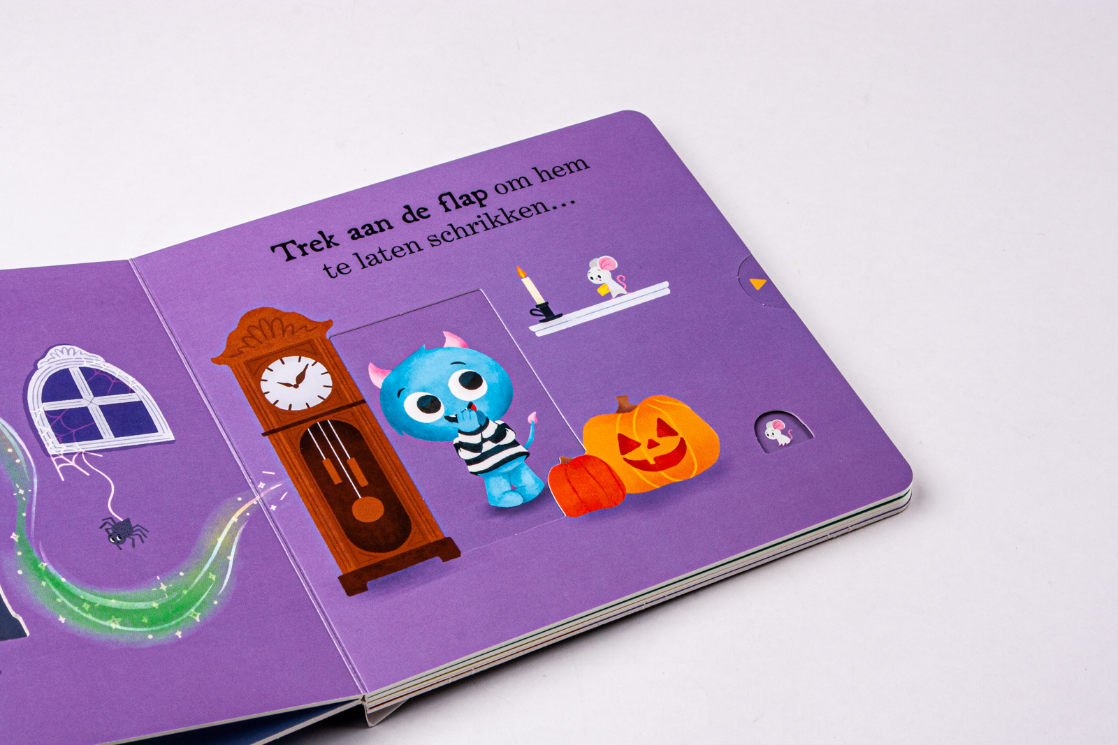 BOE! Er zweeft een guitig spookje rond in je boek… DUW, TREK en SPEEL met de interactieve elementen in dit boek en help het spookje om zijn vriendjes de stuipen op het lijf te jagen!
