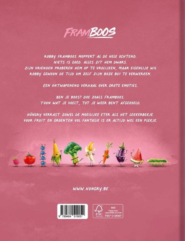Robby Framboos moppert al de hele morgen. Niets is goed. Alles zit hem dwars. Zijn vrienden proberen hem, elk op hun manier, op te vrolijken. Terwijl Robby gewoon tijd wil om zijn boze bui zelf te verwerken. Een ontwapenend verhaal over grote emoties. Ben je boos? Doe zoals Framboos. Toon wat je voelt, Tot je weer bent afgekoeld.