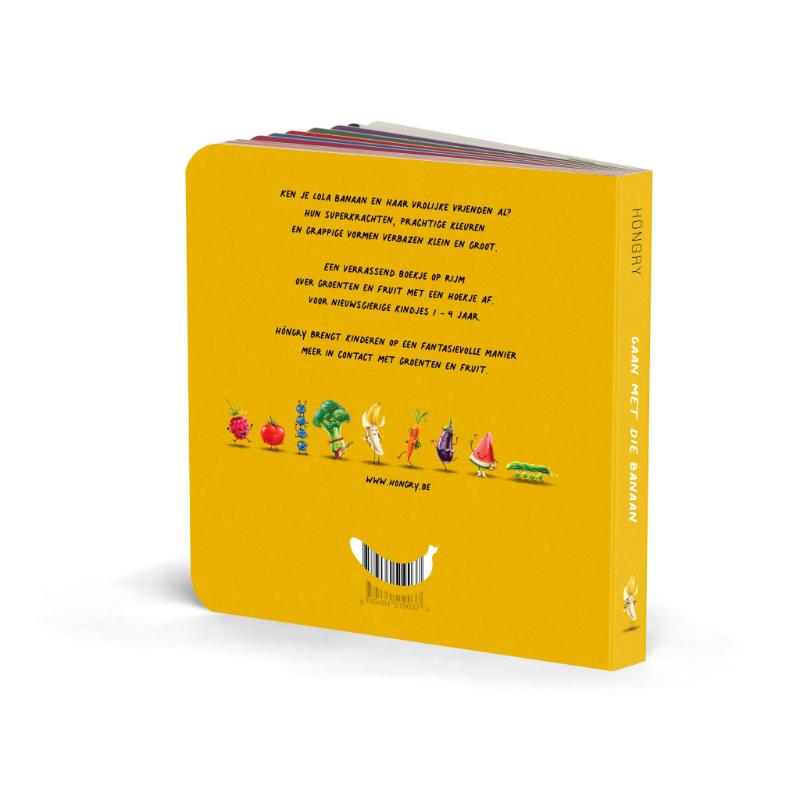 Een verrassend boekje op rijm over groenten en fruit met een hoekje af. Ken je Lola Banaan en haar vrienden al? Hun superkrachten, prachtige kleuren en grappige vormen verbazen klein en groot. Ontdek 5 groenten en 4 fruitjes en leer zo 9 kleuren kennen. HÖNGRY brengt kinderen op een fantasievolle manier meer in contact met groenten en fruit. Voor nieuwsgierige kindjes 1-4 jaar.