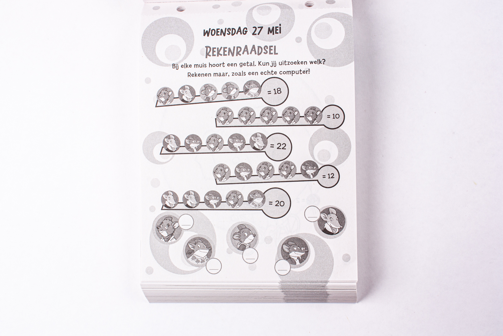 Ben je klaar voor een jaar vol muizenissig plezier? Met Geronimo's gi-ga-grote scheurkalender beleef je elke dag een nieuw avontuur. Of je nu zin hebt in een grappige mop, een pittig raadsel, een leuke puzzel of een verrassend weetje over Muizeneiland: je vindt het allemaal in deze kalender. Geronimo, Thea, Benjamain en natuurlijk Klem staan te popelen om je dagen op te vrolijken met hun guitige humor en zinderende belevenissen. Scheur elke dag een blaadje af en ontdek iets nieuws. Muizenissen verzekerd! Voor knagers die van lachen, raden en spelen houden.