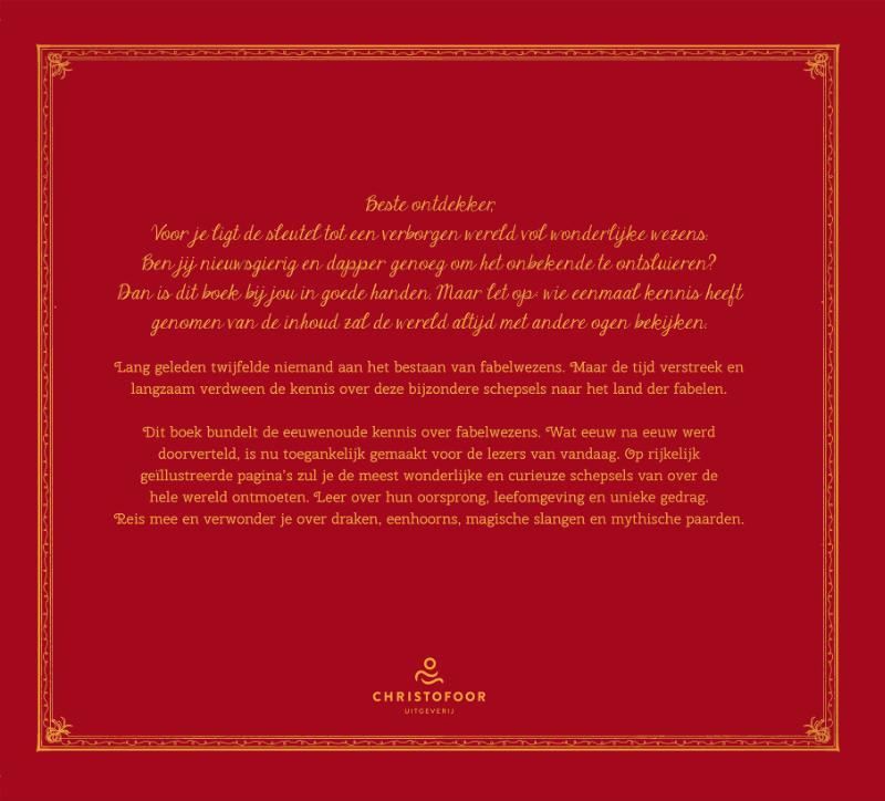 Dit boek bundelt de eeuwenoude kennis over fabelwezens. Wat eeuw na eeuw werd doorverteld, is nu toegankelijk gemaakt voor de lezers van vandaag. Op rijk geïllustreerde pagina’s zul je de meest wonderlijke en curieuze schepsels van over de hele wereld ontmoeten. Leer over hun oorsprong, leefomgeving en unieke gedrag. Reis mee en verwonder je over draken, eenhoorns, magische slangen en mythische paarden.