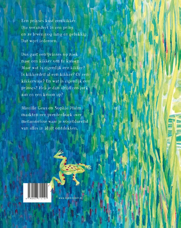 Wie er een traditioneel sprookje op naslaat, weet: een prinses trouwt met een prins en ze leven nog lang en gelukkig. En wie het sprookje ‘De kikkerkoning’ kent, weet dat er onder een kikkerhuid best zo’n knappe prins kan schuilgaan!De prinses in Is dit een kikker? gaat eropuit om zo’n prins te vinden. Maar wat is nou eigenlijk een kikker? Is kikkerdril al een kikker, of een kikkervisje? En als je dan zo’n kikker vindt… Is het dan wel de juiste kikker? Als je denkt dat de vragen daar ophouden, heb je het mis. Want wat is eigenlijk een prinses? Is een prinses een meisje met lange haren en een jurk aan, of mag ze er ook heel anders uitzien? En is ze altijd hetzelfde, of mag ze ook verschillende stijlen uitproberen?Mireille Geus schreef aan de hand van het gegeven van metamorfose een verrassend prentenboek over verandering.En als er iemand goed is in verandering, dan is het Sophie Pluim wel: met de prenten mee zie je niet alleen de personages veranderen, maar ook haar stijl! Want zo veelzijdig als de personages zijn: auteur en illustrator zijn dat net zo goed. En dan heb je nog niet alles gezien…