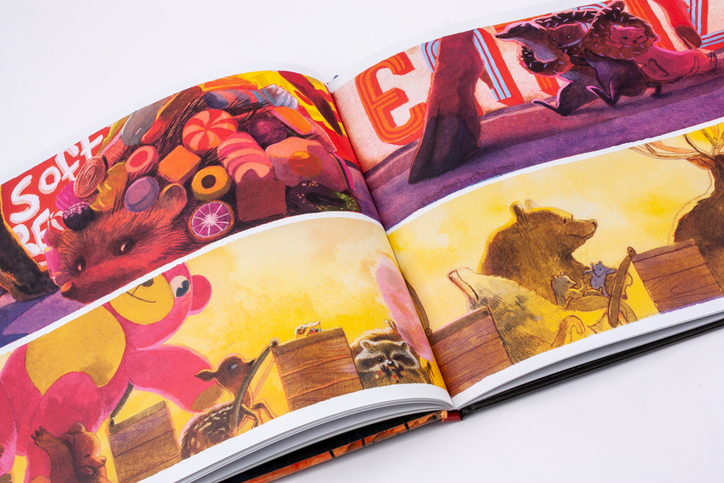 Er staat een kermis aan de rand van het bos. De hele dag is het er feest geweest. Aan het eind van de avond gaan de mensen naar huis; de lichten gaan uit en het lawaai verstomt. Maar niet voor lang! De dieren uit het bos willen op hun beurt nu plezier maken. Een dappere wasbeer trekt aan een hendel en … alle lampen springen aan, de achtbaan gaat weer rollen en de dieren nemen bezit van de attracties. Ga met ze mee en maak een wilde rit door deze magische, prachtige kermis in de nacht! Een filmisch geïllustreerd prentenboek met zo’n sterk beeldend verhaal dat tekst niet nodig is. Als je wilt kun je zelf de woorden erbij verzinnen maar met open mond genieten van de prachtige tekenstijl mag natuurlijk ook.