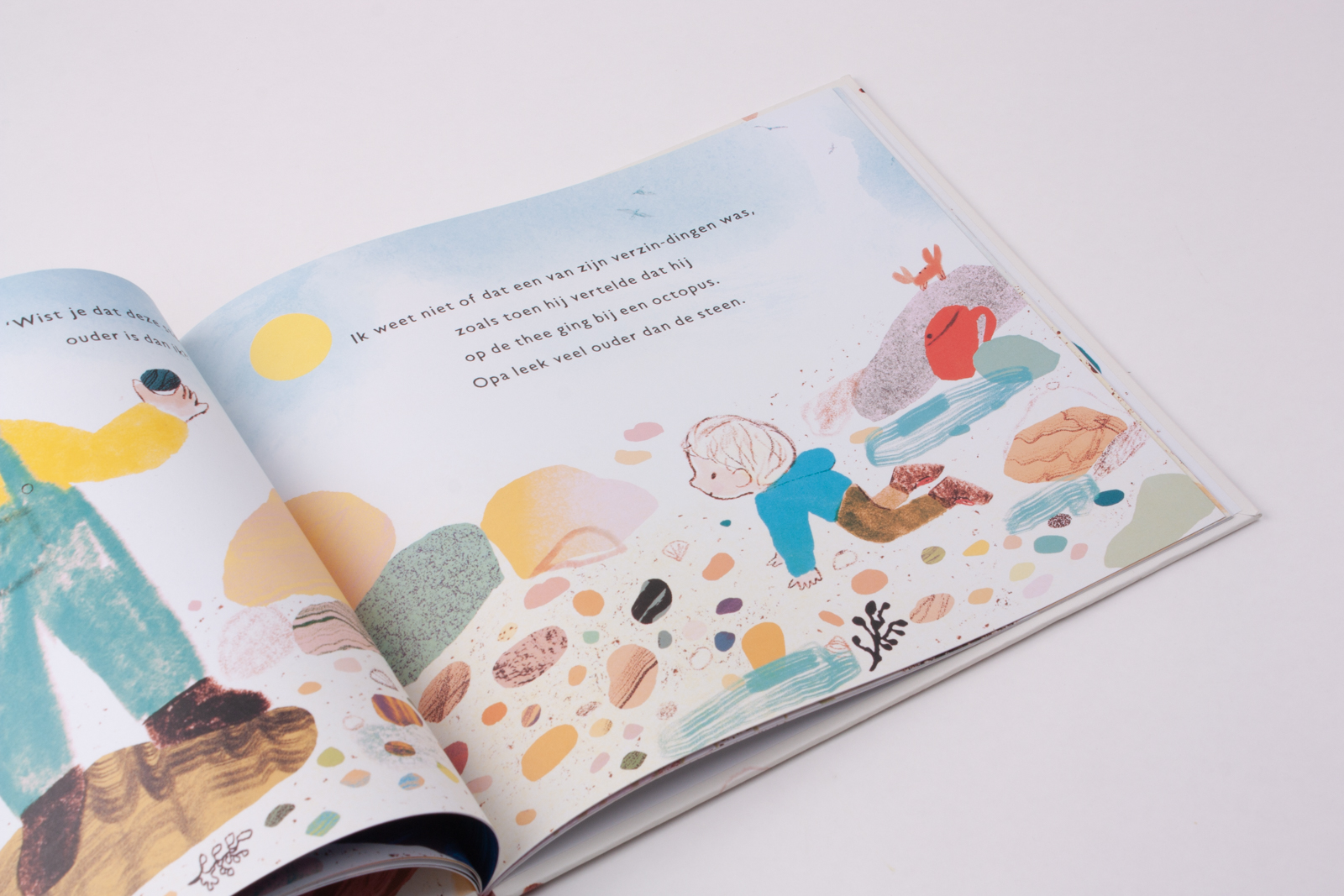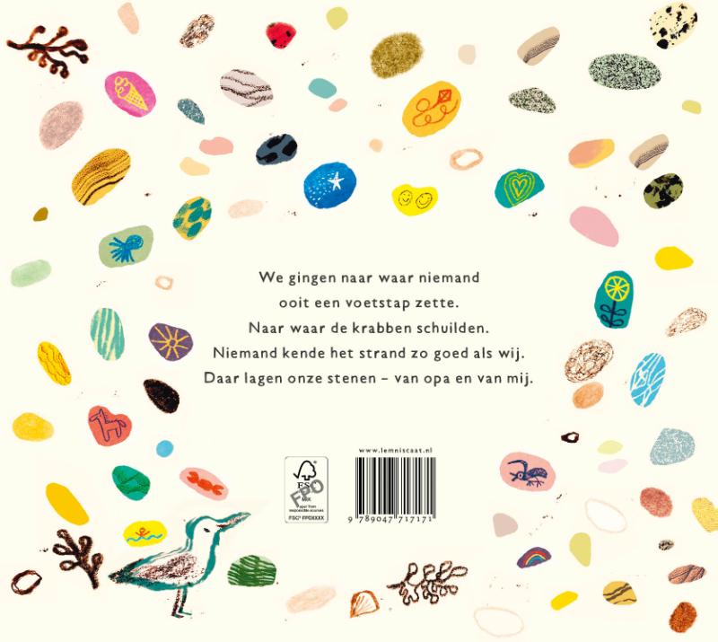Opa wist altijd de beste weg naar het kiezelsteenstrand, door het wiebelbos, langs de treinen en de hondjes. En als ze het duin beklommen, roken ze de zee al. Op het strand ontmoetten ze een zeehond, vonden ze hout van een piratenschip en aten ze smeltende ijsjes… en elke keer voordat ze vertrokken, kozen ze allebei een kiezelsteentje om mee naar huis te nemen. Maar toen moest opa verhuizen.Een prachtig prentenboek over herinneringen en omgaan met verandering, van de maker van De jongen met bloemen in zijn haar en Dank je wel. In meeslepende taal en zachte, zonovergoten illustraties laat Jarvis zien dat herinneringen altijd voor het oprapen liggen, net als steentjes op een kiezelstrand.