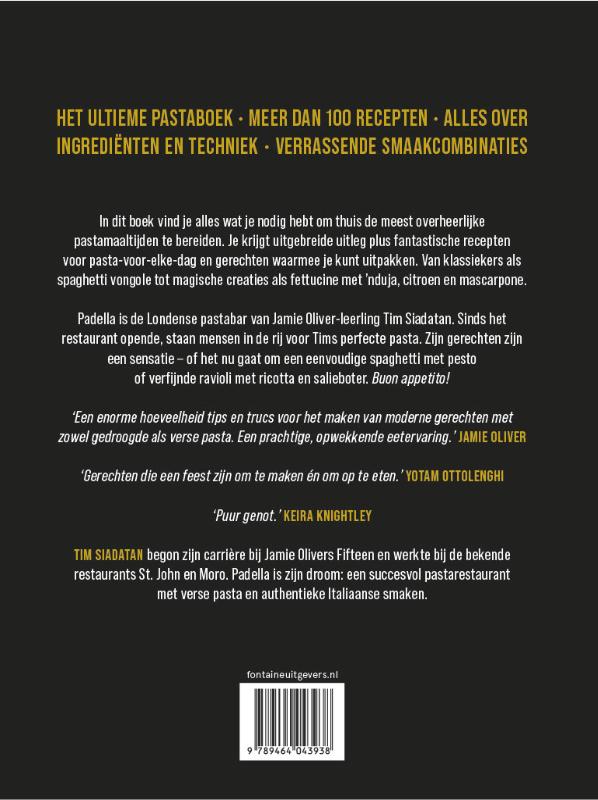 Het ultieme pastaboek van Jamie Oliverleerling Tim Siadatan, chef en eigenaar van de Londense hotspot PadellaSinds Tim Siadatan zijn restaurant Padella in Londen opende, staan mensen buiten in de rij voor zijn perfecte pasta. Tims gerechten zijn een sensatie – of het nu gaat om een eenvoudige spaghetti met pesto of verfijnde ravioli met ricotta en salieboter. In het gelijknamige boek Padella vind je alles wat je nodig hebt om thuis de meest iconische en overheerlijke pastamaaltijden te bereiden. Dit boek bevat uitgebreide uitleg over de beste ingrediënten en technieken plus meer dan honderd fantastische recepten. Van klassiekers als spaghetti vongole tot Tims magische en vernieuwende creaties zoals fettucine met ’nduja, citroen en mascarpone, en van pastavoor- elke-dag tot feestelijke gerechten waar je mee kunt uitpakken. Met Padella zet elke thuiskok pasta van restaurantkwaliteit op tafel.• De beste 100+ pastarecepten • Alles over de techniek, ingrediënten en smaakcombinaties• Met een voorwoord van Jamie Oliver• Voor liefhebbers van Toscanini en Brutto‘Tim deelt een hoeveelheid aan eenvoudige tips en trucs voor het maken van moderne pastagerechten met zowel gedroogde als verse pasta. Het boek getuigt van zijn toewijding en biedt niet alleen een prachtige, maar ook enerverende eetervaring, waar je gaandeweg van kunt leren.’ JAMIE OLIVER ‘Gerechten die een feest zijn om te maken én om op te eten.’ YOTAM OTTOLENGHI