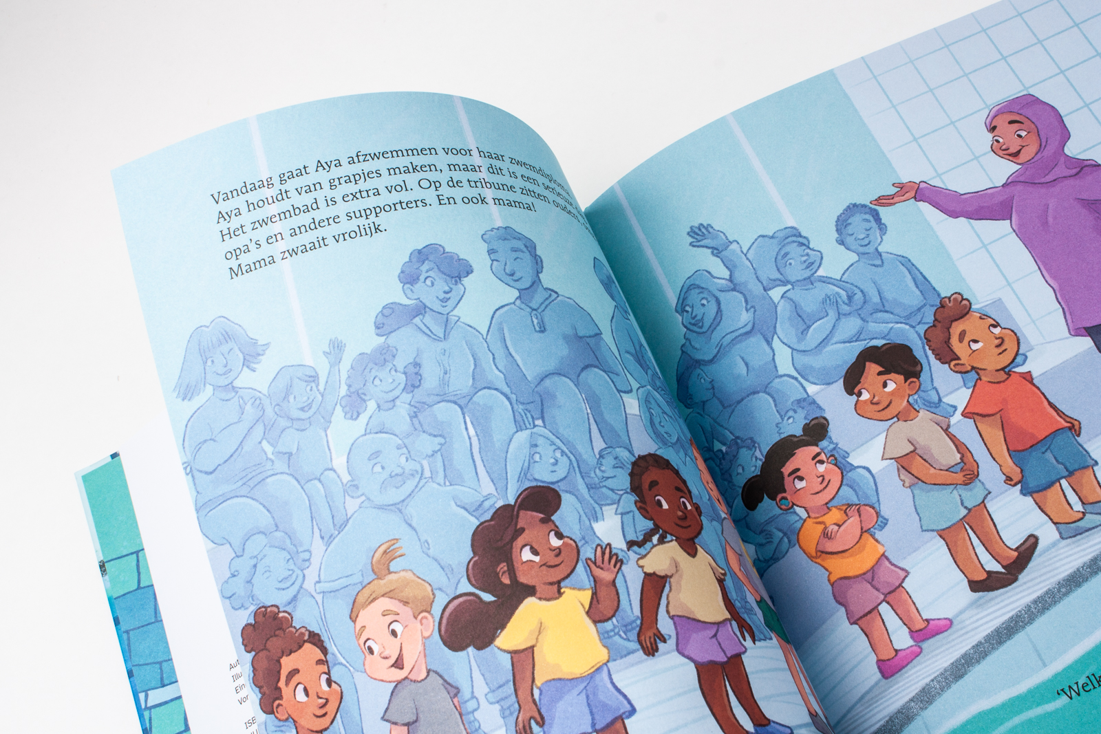 Vandaag gaat Aya haar zwemdiploma halen! Ze heeft haar allerleukste badpak aangetrokken: een oranje met een groene vis erop. Ze bibbert een beetje... het water lijkt megadiep. Aya kijkt snel naar haar moeder, die haar een dikke duim omhoog geeft. Dan haalt Aya diep adem en... PLONS!