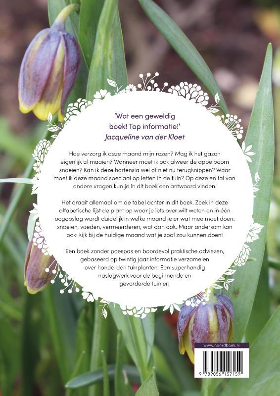 Hoe verzorg ik deze maand mijn rozen? Mag ik het gazon eigenlijk al maaien? Wanneer moet ik ook alweer de appelboom snoeien? Kan ik deze hortensia wel of niet nu terugknippen? Waar moet ik deze maand speciaal op letten in de tuin? Op deze en tal van andere vragen kun je in dit boek een antwoord vinden. Het draait allemaal om de tabel achter in dit boek. Zoek in deze alfabetische lijst de plant op waar je iets over wilt weten en in één oogopslag wordt duidelijk in welke maand je er wat mee moet doen: snoeien, voeden, vermeerderen, wat dan ook. Maar andersom kan ook: kijk bij de huidige maand wat je zoal zou kunnen doen! Een boek zonder poespas en boordevol praktische adviezen, gebaseerd op twintig jaar informatie verzamelen over honderden tuinplanten. Een superhandig naslagwerk voor de beginnende en gevorderde tuinier!