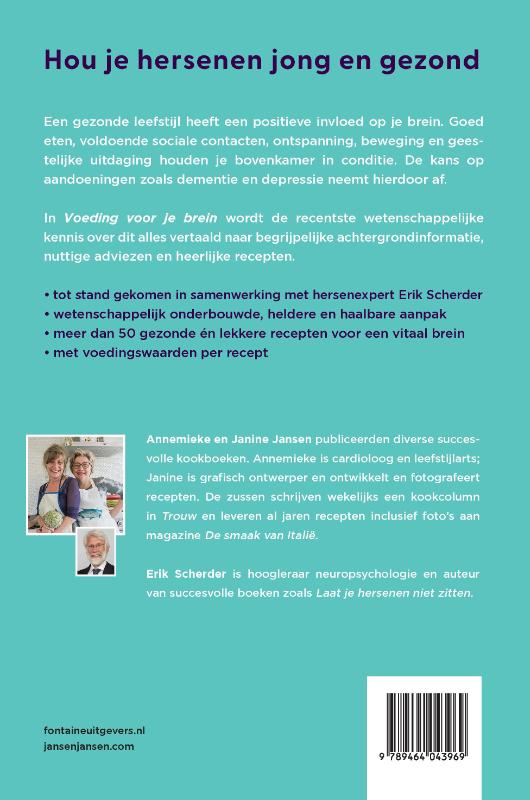 Hét kookboek voor wie zijn hersenen gezond wil houdenIn Voeding voor je brein laten cardioloog Annemieke en receptenmaker-vormgever Janine Jansen samen met professor Erik Scherder zien hoe je met een eenvoudig én lekker eetpatroon je hersenen jong kunt houden. Cognitieve prestaties verbeteren en het risico op hersenaandoeningen zoals dementie en een depressie wordt kleiner. De zussen Jansen vertalen zoals altijd de meest recente wetenschappelijke kennis naar begrijpelijke informatie, concrete acties en heerlijke, fraai in beeld gebrachte recepten. Met de juiste voeding, voldoende rust en beweging, weinig stress en veel geestelijke uitdaging kun je je bovenkamer beter laten functioneren, met wat geluk ook tot op hoge leeftijd.• Geschreven door cardioloog Annemieke Jansen, hersenexpert Erik Scherder en receptontwikkelaar Janine Jansen• Actueel onderwerp in media en gezondheidszorg: invloed van leefstijl en voeding wordt steeds duidelijker• Met toegankelijke, wetenschappelijk onderbouwde uitleg over de werking van het brein en de invloed van leefstijl daarop • Helder en haalbaar stappenplan met lekkere en eenvoudige gerechten De pers over de auteurs en eerdere boeken:‘Erik Scherder schudt je wakker!’ Psychologie MagazineOver CholesteroI van Annemieke en Janine Jansen:‘Het is helemaal niet zo moeilijk om gezonder te eten.’ Santé‘Een inspirerend boek [...]. De recepten zijn gevarieerd en creatief.’ Trouw