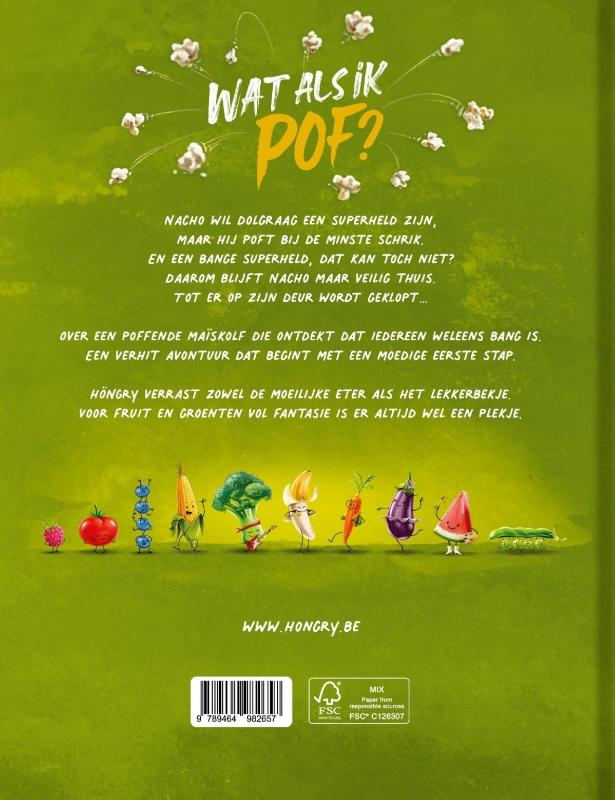 Nacho wil dolgraag een superheld zijn, maar hij poft bij de minste schrik. En een bange superheld, dat kan toch niet? Daarom blijft Nacho maar veilig thuis. Tot er op zijn deur wordt geklopt… Over een poffende maïskolf die ontdekt dat iedereen weleens bang is. Een verhit avontuur dat begint met een moedige eerste stap. HÖNGRY verrast zowel de moeilijke eter als het lekkerbekje. Voor fruit en groenten vol fantasie is er altijd wel een plekje.