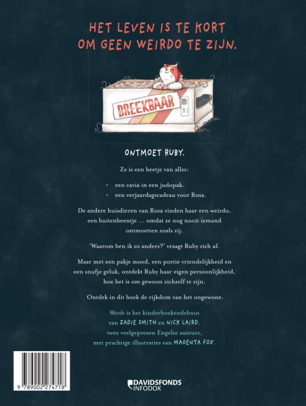 Ontmoet Ruby. Ze is een beetje van alles: • een cavia in een judopak. • een verjaardagscadeau voor Rosa. De andere huisdieren van Rosa vinden haar een weirdo, een buitenbeentje … omdat ze nog nooit iemand ontmoetten zoals zij. ‘Waarom ben ik zo anders?’ vraagt Ruby zich af. Maar met een pakje moed, een portie vriendelijkheid en een snufje geluk, ontdekt Ruby haar eigen persoonlijkheid, hoe het is om gewoon zichzelf te zijn. Ontdek in dit boek de rijkdom van het ongewone. Weirdo is het kinderboekendebuut van Zadie Smith en Nick Laird, twee veelgeprezen Engelse auteurs, met prachtige illustraties van Magenta Fox.